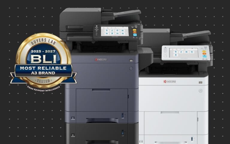 Kyocera was named BLI’s 2025-27 Most Reliable A3 Brand following five years of thorough testing. According to BLI – “In a controlled, conditioned lab environment, Kyocera devices consistently demonstrated exceptional reliability, achieving high volumes of impressions with remarkably low misfeed rates and no service calls. When compared with other devices, Kyocera’s office technology was found
